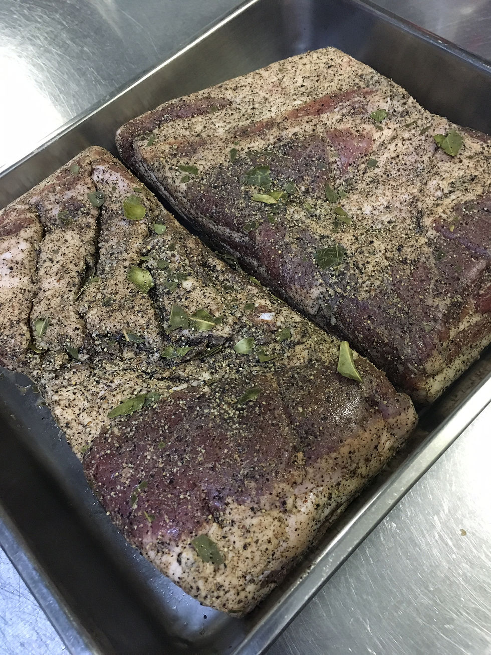 明日から始まる氷解の節気「立春」コースの前菜で使うベーコンを仕込みました。